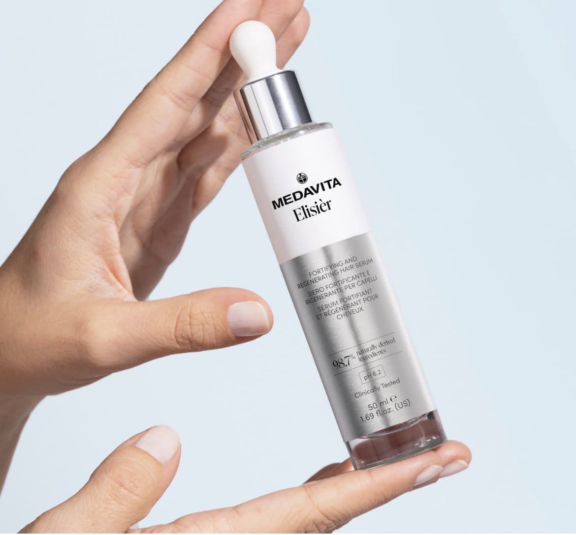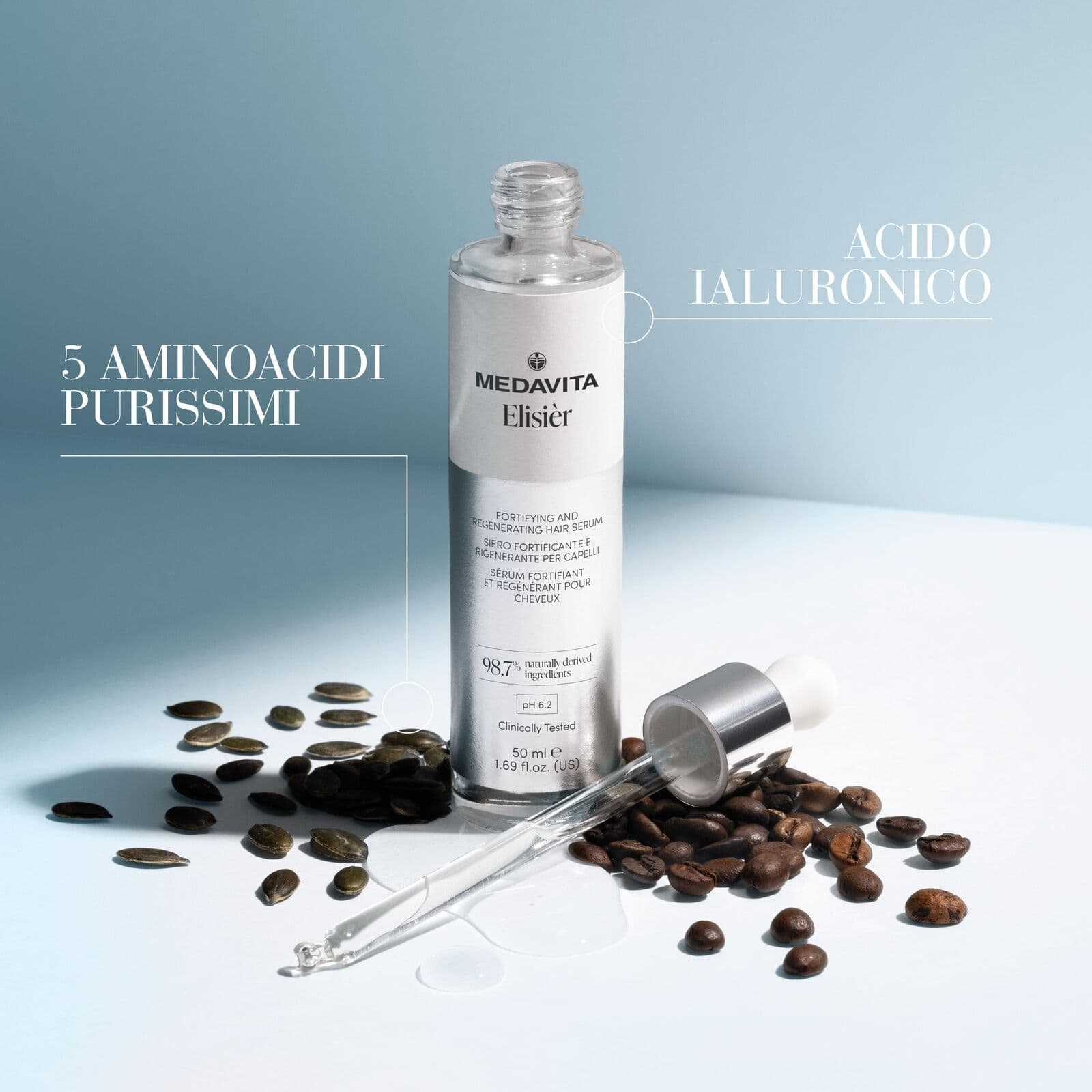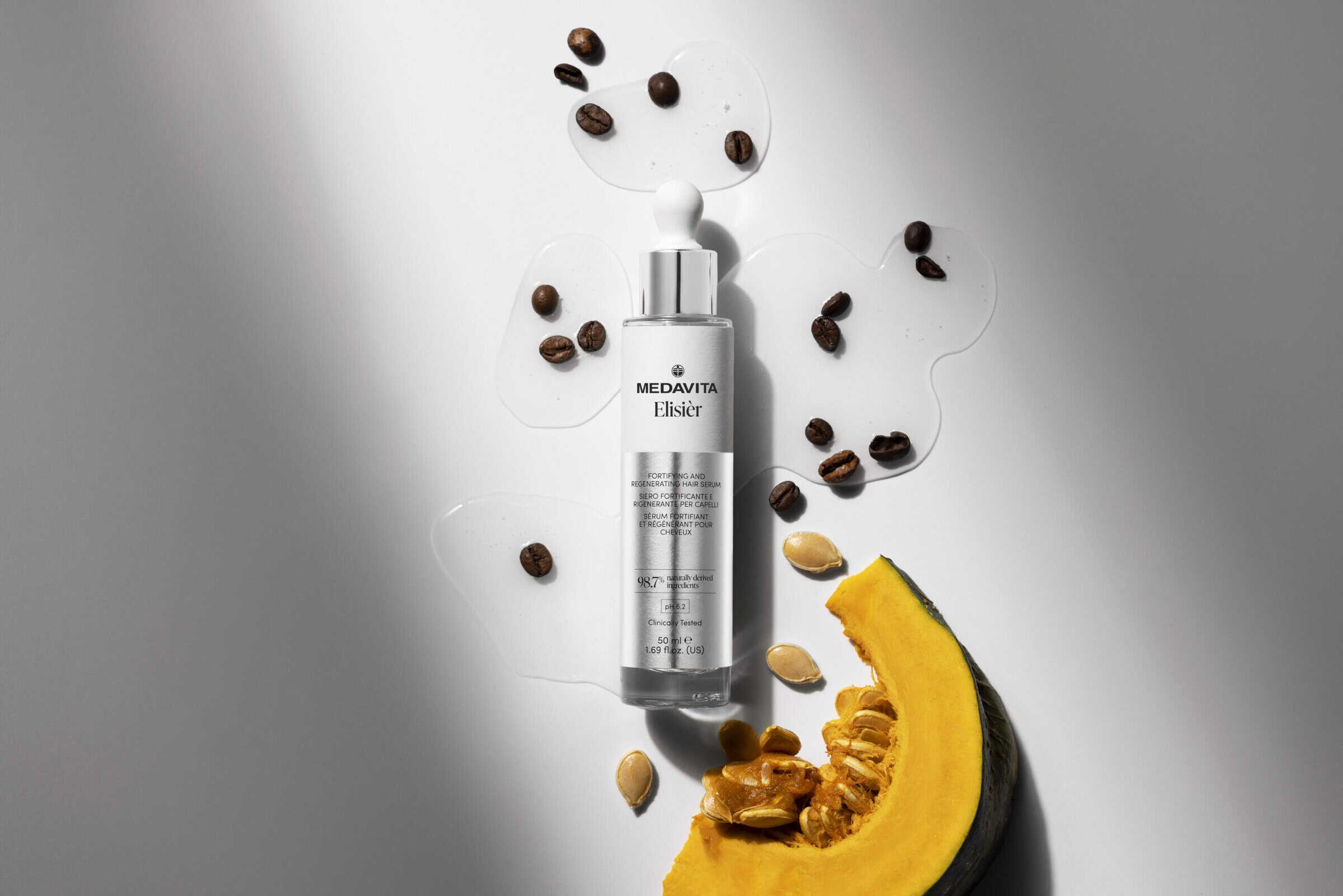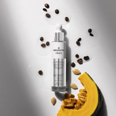 Elisièr de la Medavita, un ser inovator, redefinește îngrijirea părului oferind putere, rezistență, strălucire și volum. Cu fiecare utilizare, fibra capilară devine mai plină de vitalitate și frumusețe. Conținând ingrediente precum acid hialuronic, 5 aminoacizi, cafeină, bisabolol, extract de Saccharomyces Cerevisiae și extract de semințe de dovleac, acest ser asigură o îngrijire de calitate superioară pentru scalp și păr.