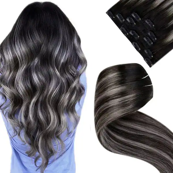 Extensii de păr clip-on balayage negru cu gri 60 cm : Set complet 12 piese cu 20 de clipsuri
